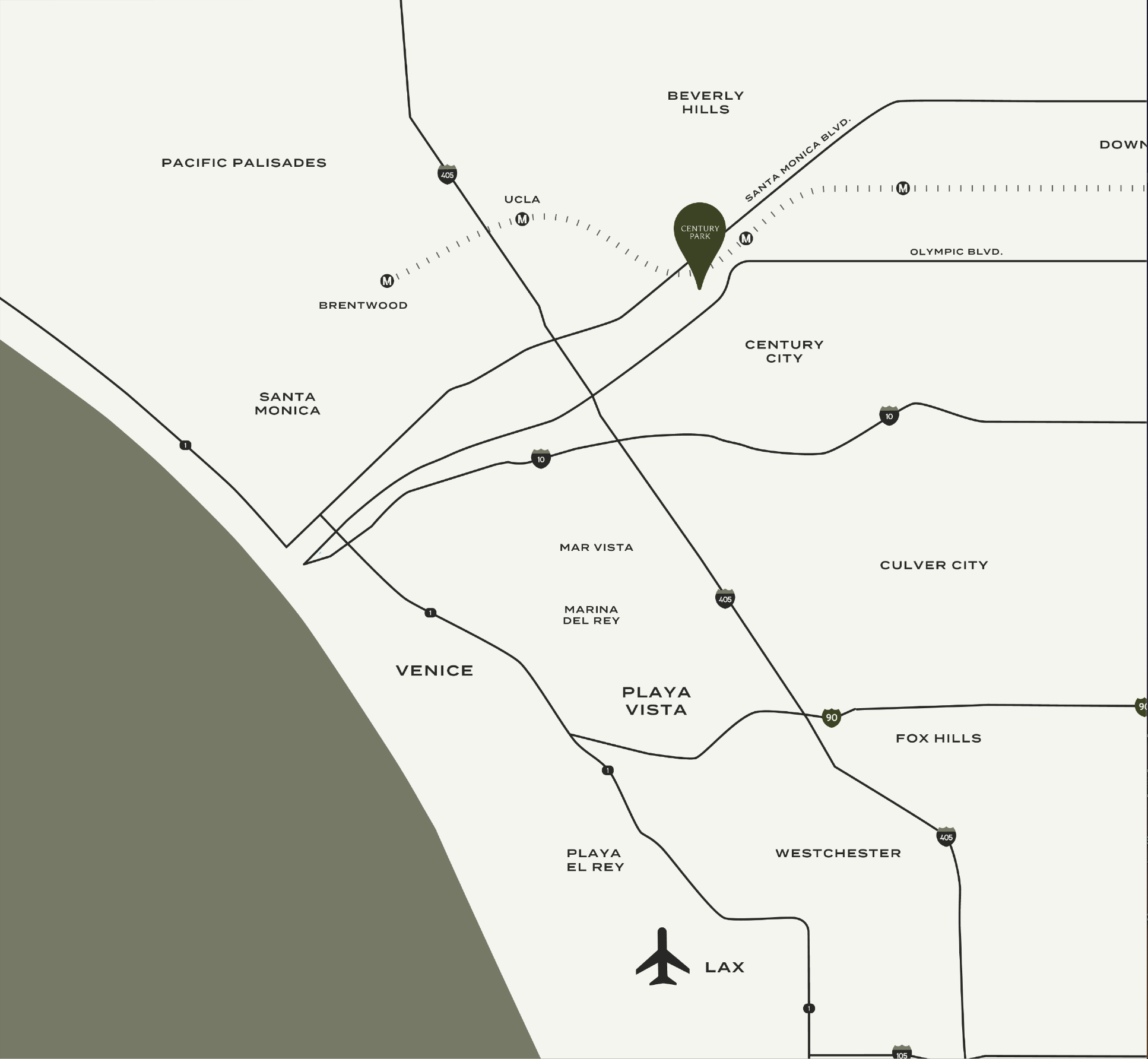 Century Park is at the heart of Los Angeles, offering a transit-friendly location with easy access to major freeways, nearby shopping, dining, and entertainment, and the upcoming Metro Purple Line arriving in 2026.